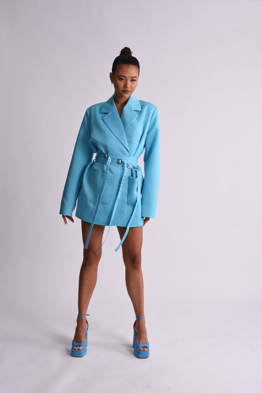 'Sofia' Triple Belted Satin Blazer Dress - Blue